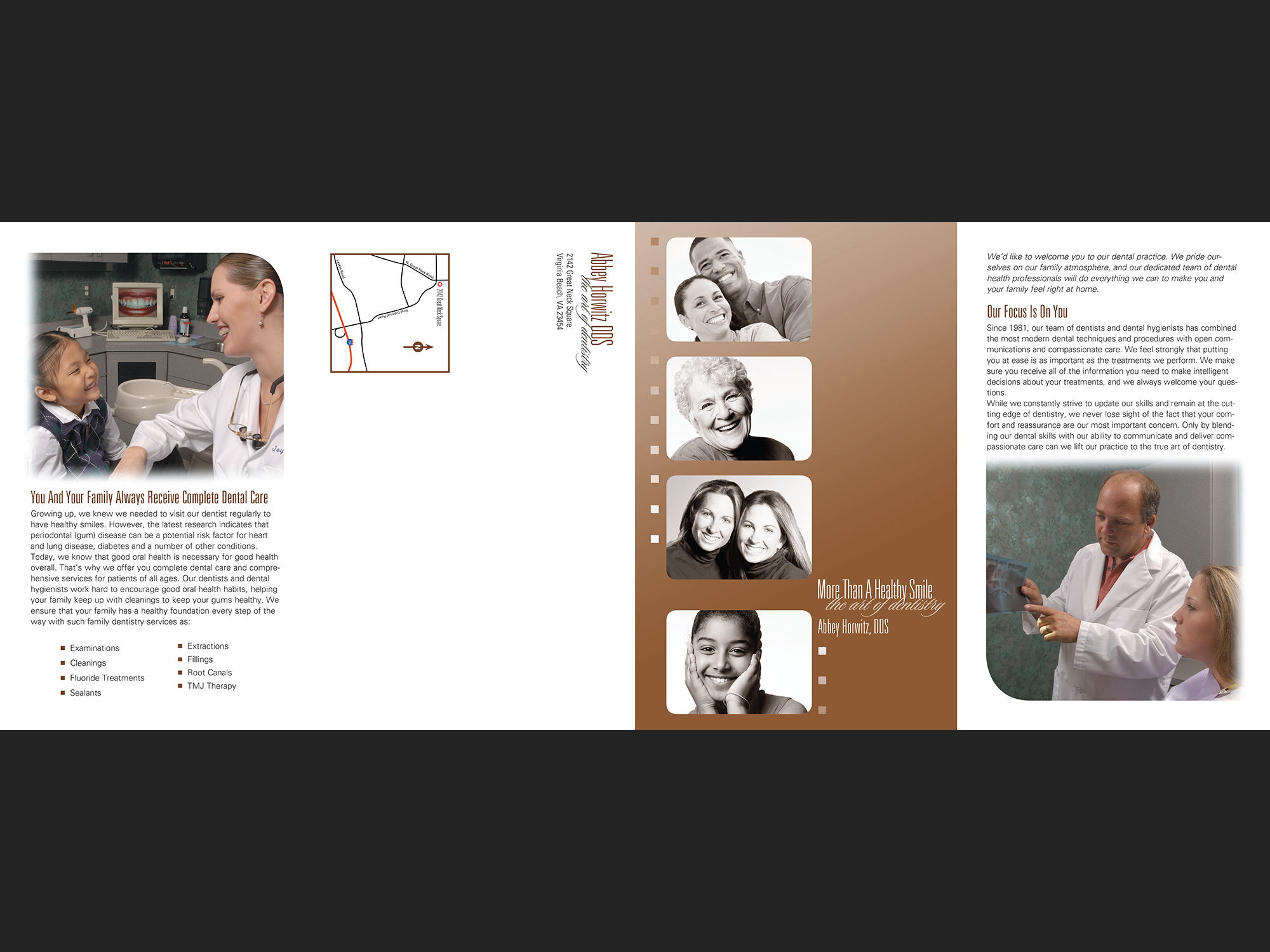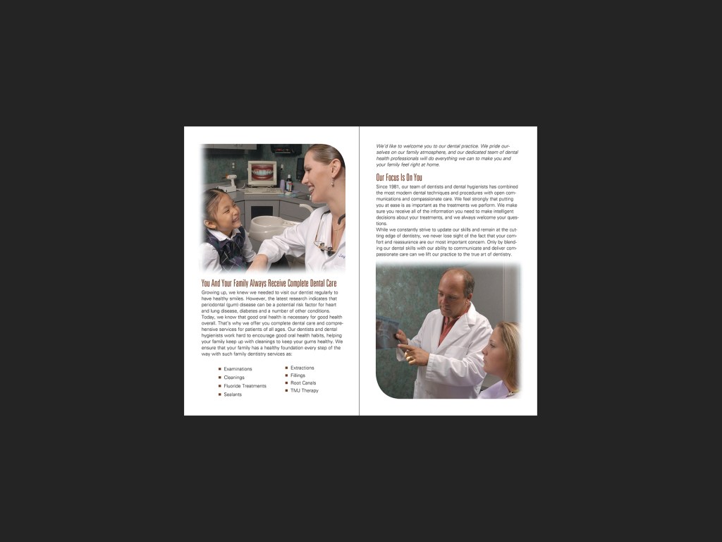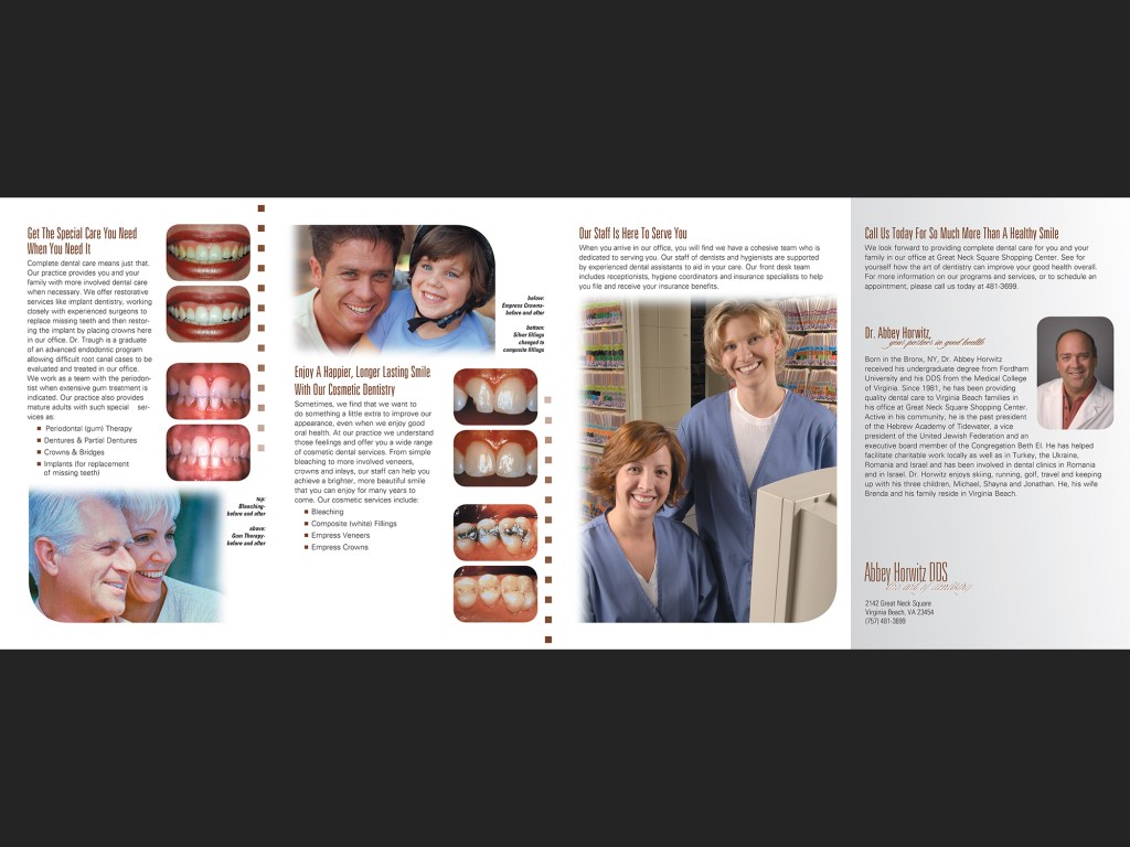 The Art of Dentistry, Abbey Horwitz, DDS Double gate fold brochure; self mailer, 2004. Photography by Glen McClure along with stock. Click on any image for a slideshow view. Share this: Share on Facebook (Opens in new window) Facebook Share on LinkedIn (Opens in new window) LinkedIn Like Loading...